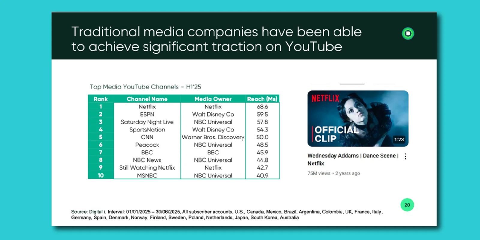 In the session “The Global Viewer Journey: From SVOD to YouTube and Back Again”, Matt Ross from Digital I, shared that in first half of 2025, streamers and broadcasters have channels reaching huge audiences through YouTube channels: Netflix (68.9m), ESPN (59.5m) and Saturday Night Live (57.8m). In a deep dive on the BBC in Q4 2024, it reached 13.7m through 15 channels (BBC, BBC News, BBC Music being the largest).