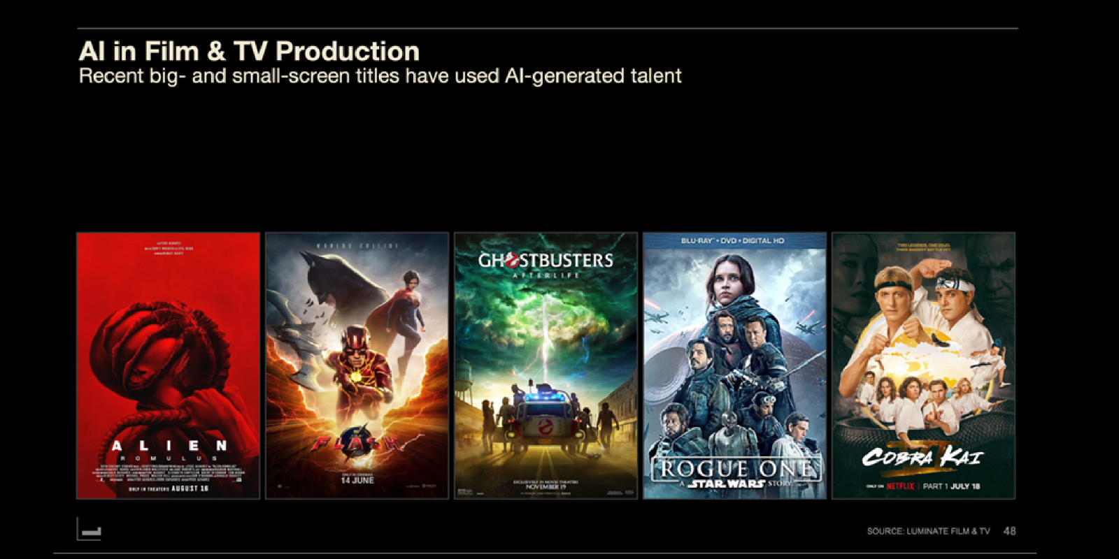 In the previously referenced Luminate presentation some titles already released using AI are Alien Romulus, Flash, Ghostbusters Afterlife and Rogue One.