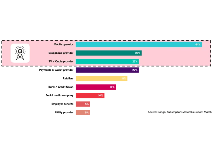 When asked who should provide such a service, subscribers listed telcos as their preferred provider, specifically mobile operators (44%), broadband providers (23%), TV/Cable/CTV providers (22%).Other preference are for payments and wallet providers (22%), retailers (18%), banks or credit unions (14%), social media companies (10%), employee benefits companies (5%) and utility providers (5%).
