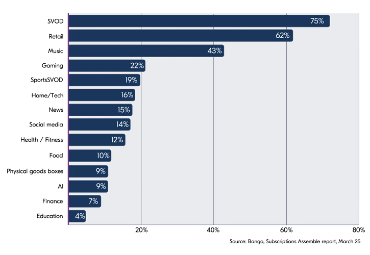 Popular subscriptions in the US are SVOD (such as Netflix, HBO Max, Disney+), Retail (e.g. Amazon Prime, Walmart+) and Music (e.g. Apple Music, Spotify).